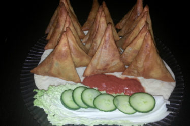 Serveres med raita Her ,salat og sterk chili saus .