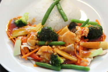 Ha 3ss olje i wok over middels varme ,tilsett hvitløk,ingefær og chili. stek i 2 min