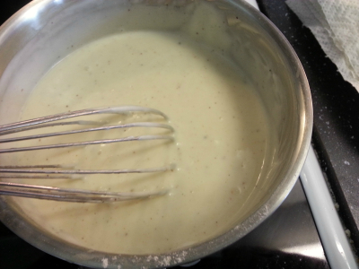 Lag bechamelsausen: Hell melk i en kjele,og tilsett laurbærblad,pepperkorn og løk.Varm melken til rett under kokepunktet,trekk kjelen av varmen,legg på lokk,la smakene utvikle seg i 10 minutter,og sil væsken.
