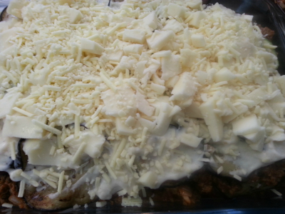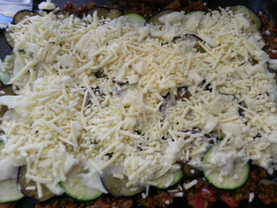 Fortsett å legge lag til alle ingredienser er brukt-slutt prosessen med et lad aubergine og squash ,resten av bechemelsaus ,mozzarilla og ost.