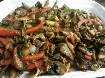 Ha litt olje i en stekepanne og tilsett løk og sopp ,stek litt så ha over biff,paprika ,litt av grillkrydder og salt .la alt stekes til kjøttet er ferdig stekt.Bruk over middels varme til sterk varme.