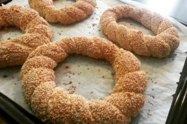 Ha deigen på melet kjøkkenbenken og del til 3 boller ,ha på fuktig kjøkkenhåndkle og la den hvile i 10 min.