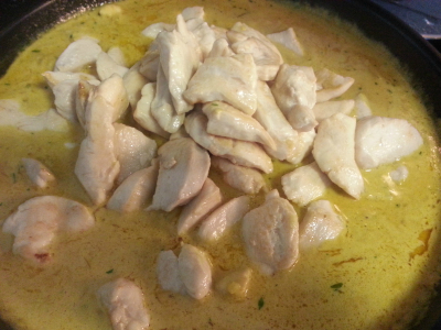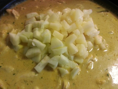 Tilsett resten av ingrediensene kokosmelk ,fløte og alt unntatt kyllingen,eple og ananas.