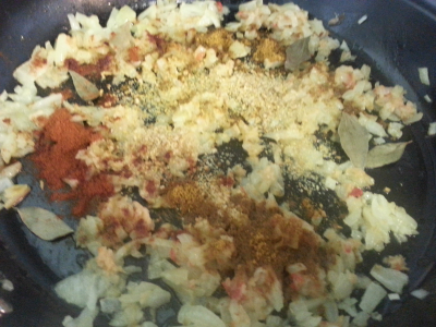 Tilsett curryblader,malt sennep,malt bukkehorn,paprikapulver,karripulver og fres i 1-2 min .