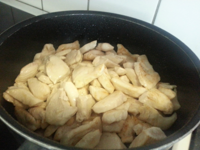 Brun kyllingen i litt olje om gangen ,legg til side og holde den varm.Eller du kan steke kyllingen til slutt og tilsette den til sausen.
