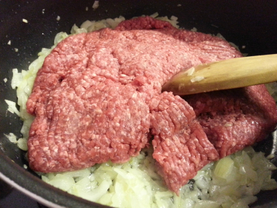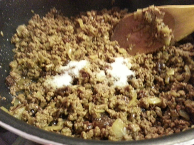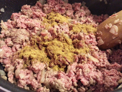 Og krydder,stek videre til kjøttet er ferdig stekt.