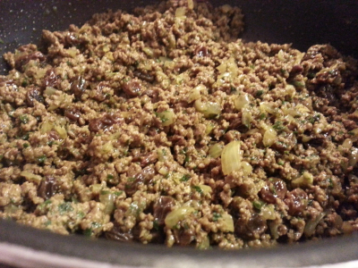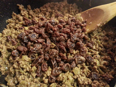 Hell vannet av rosiner,og tilsett rosinene i stekepanne.