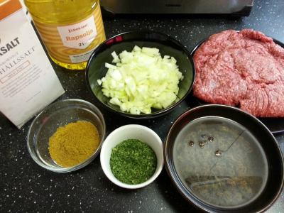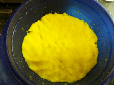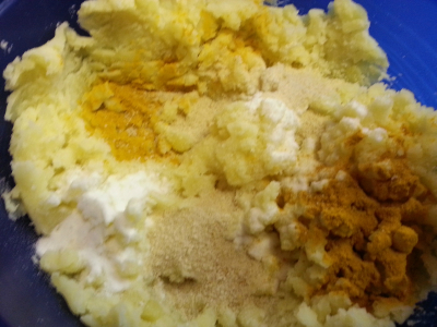 Tilsett gurkemeie ,strøbrød og maziane og vann .Bland alt sammen.