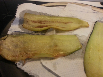 Legg over kjøkkenpapir og la olje renner ut fra auberginene.