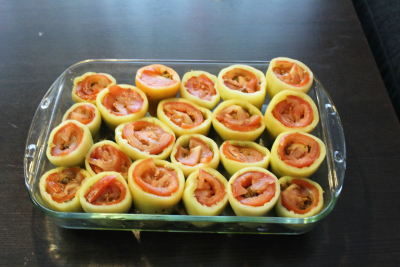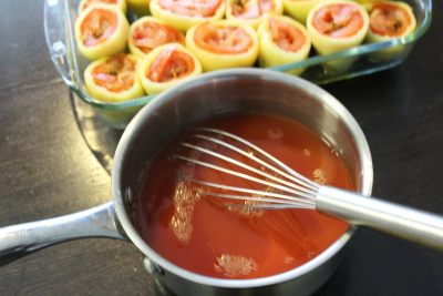 Legg paprika i tallerken og hell over tomatsausen