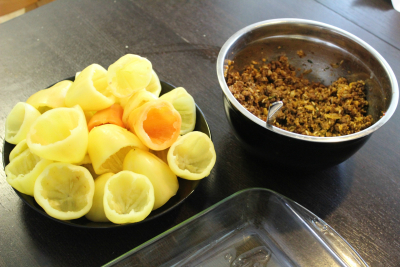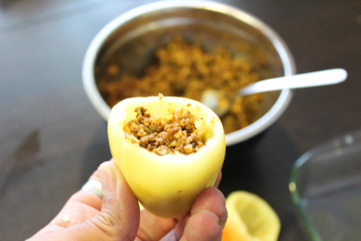 Fyll paprika med kjøttdeigblandingen,bruk en skje og stappe fyllet.