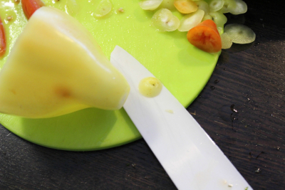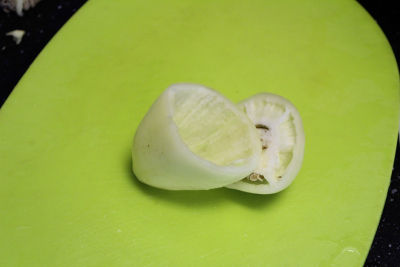Skjær litt av bunnen (om du skal bruke paprika som er spiss på bunnen for at den skal står i formen)