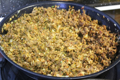 Tilsett risen og bulgur og surre litt så ha over kjøttdeigen og bland sammen så resten av ingrediensene unntatt granateplesirup,bland alt sammen og tilsett granateplesirup, smak til med salt og pepper,skru av varme og legg til side.
