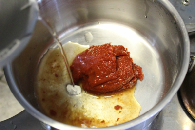 Tomatsaus ,ha tomatpurre i en kjele og tilsett vannet ,sukker og salt.