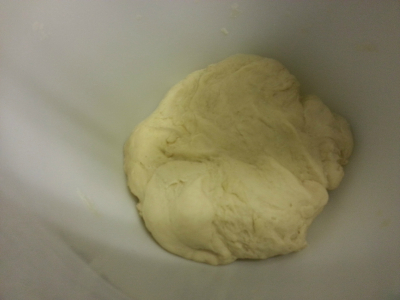 Ha 2dl av mel med gjær,sukker og salt i kjøkkenmaskin og bland sammen.