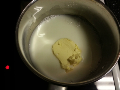 I en kjele varm sammen smør,vann og melk ,akvkjøl.