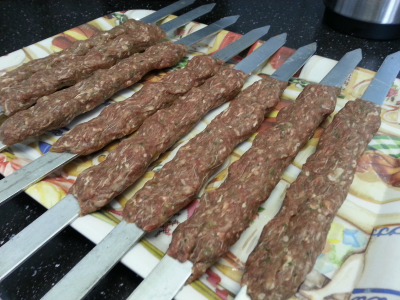 Del kjøttet til like størrelse,jo midre biter du bruker jo bedere for at du grille disse raskt. Sett kjøttet på syd som du har brede eller tynne med hjelp av hånden (fukt hånden med litt vann mens du kleme kjøttet og drar på spyden,klem endene til slutt.)