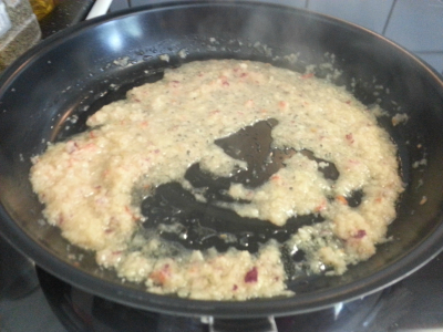 Tørrstek ved svake varme under omrøring,til blandingen har fått en dyp,nøttbrun farge.