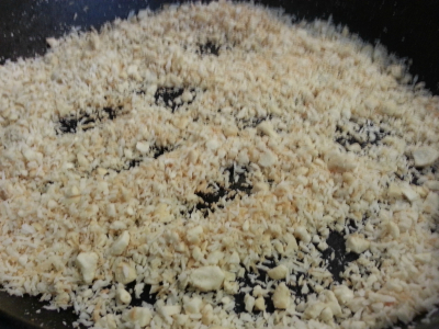 Mens curryen koker,knus cashewnøtter i en morter.Legg nøttene i en tykkbunnet stekepanne sammen med kokosmassen.