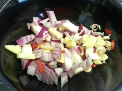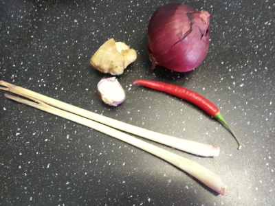 Skrell løken,ingefær,hvitløk,sitrongress og ta frø ut fra chili