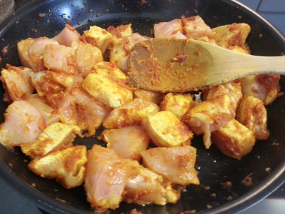 Tilsett krydderpastaen og rørstek ved svak varme i 1-2 minutter,til det lukter godt.