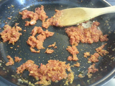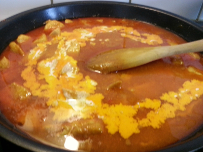 Tilsett tomatpurre ,gurkemeie og rørstek i 1-2 minutter.