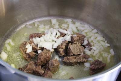 Varm en stor gryte med smør så tilsett kjøttet og løken,stek i 3-4 minutter på middels varme.