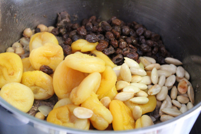 Aprikoser og rosiner legges i varm vann ca 1 time ,bytter du vannet to eller tre ganger ganger.så i et dørslag