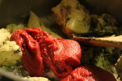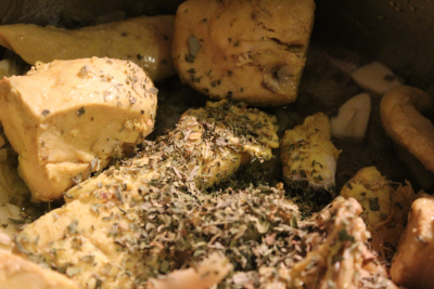 Tilsett kyllingen hvitløken og tørkede bukkehornkløver,fres i 4-5 minutter.