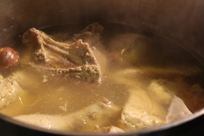 Ta kyllingen fra kjelen og fjern skinnet.sil kraften og la den små koke i 15 minutter.