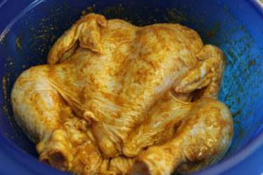Deler du kyllingen i biter,legg i en kjele og dekk med vann,kok opp og skumme av .ha karri ,gurkemeie ,salt og tørkede lime.Kok opp så skru ned varme og la den små koke i 15 minutter.(kyllingen skal ikke være helt gjennom stekt.