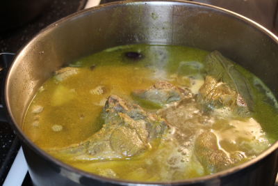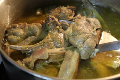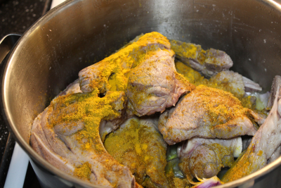 Dekk med varmt vann og kok opp ,skumme av så ha på lokk og la den små koke i 1 time ,etter 1 time tilsett salt og ha på lokk igjen.