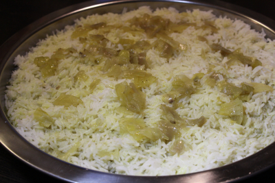 I en stor fat ha risen så øs over kraften fra lammekjøtt med løken.