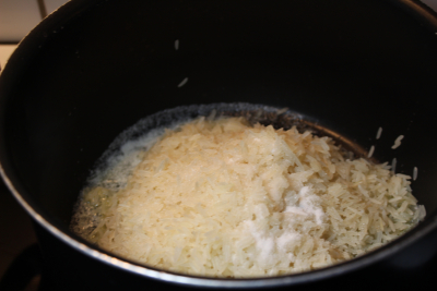 Tilsett risen med salt og surre i 1-2 min.