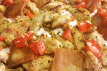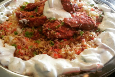 Serveres med raita Her ,salat og sterk chili saus .