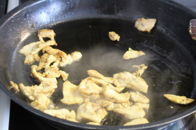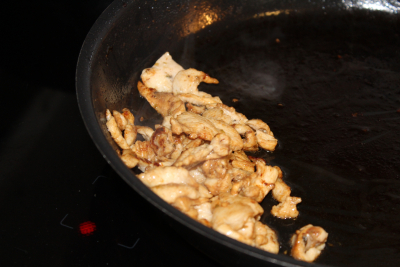 I samme stekepanne ha litt olje over høy varme og stek kylling litt om gangen.