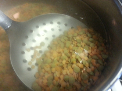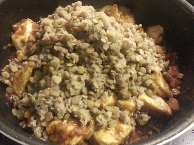 Når linsene er kokt (sil linsene) hell dem over kyllingen og rist gryten,slik at de blandes med grønnsakene.