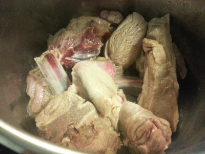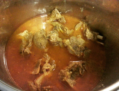 Sett kokeren på maksimal styrke ,når dap begynner å komme ut av ventilen,setter du ned varmen og lar det små koke i 45 minutter .Eetter tiden har gått slår du av kokeplaten,vri funksjonsventilen tiltallet damp .Når trykkmåleren synker,er kokeren ikke lenger under trykk.Åpne kokeren og se om kjøttet er mørt ,smak til med salt og pepper
