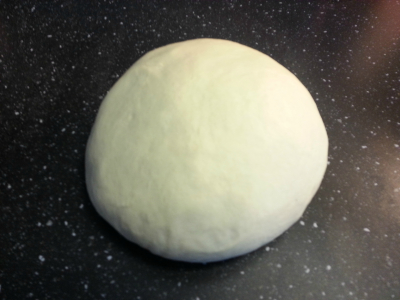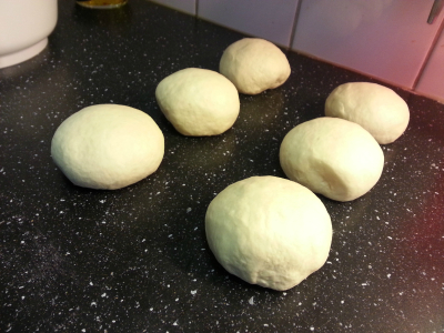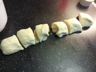 Ha deigen på kjøkkenbenken og press ned luftten ut av deigen og elt i 2 minutter. Del ti 6 like stk.