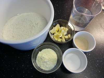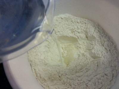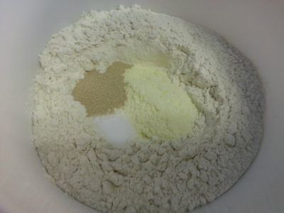 I en stor bolle ,blande sammen hvetemel,sukker,gjær,melk og salt.