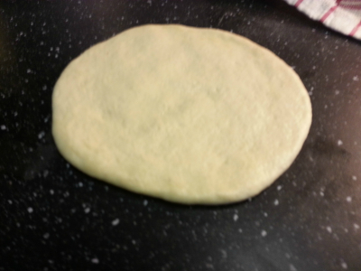 Press en bolle litt ned med hånde og form til en runde brød men ikke så tynn.Bruk hendene dine og med hjelp av litt olje.