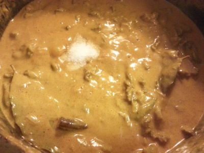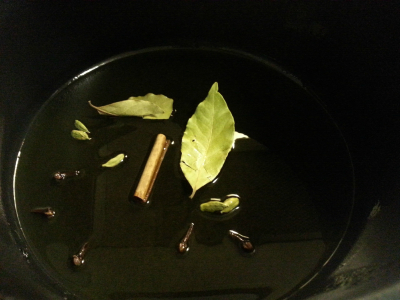Varm oljen i en middels stor gryte over lav varme,og tilsett kanelstang,kardemomme,nellik og laurbærblad.Stek det i 1 min.