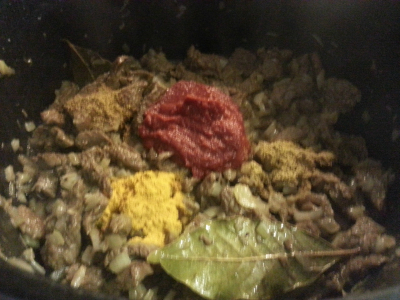 Rør jevnlig ,og tilsett tomatpure,gurkemeie,malt koriander og spisskummen.La det koke i 4 minutter.