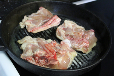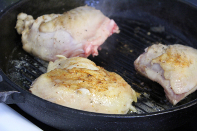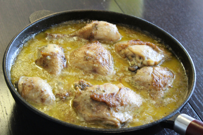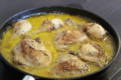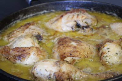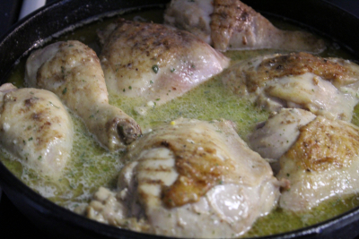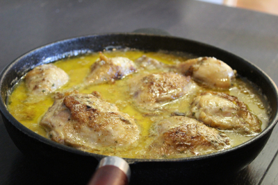 Ha litt olje og smør i en jernstekepanne eller gryte og brun kyllingen raskt over høy varme.