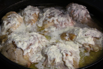 Legg kyllingen i en form eller samme jernstekepanne og hell over fløteblandingen