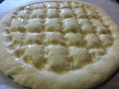 Ta en bolle og kjevle i runde form men ikke kjvle for tynn ,bare litt .Sett brødet i stekebrett medbakepapiret under.Dypp fingrene dine i pensling blandingen og lager du firekanter som du ser på bildet.