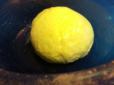 Smør bollen med litt olje og legg deigen i så ha litt olje over deigen.Dekk med et fuktig kjøkkenhåndkle og la den heve 1 time til 1 1/2 time ,til dobblte av sin størrelse.