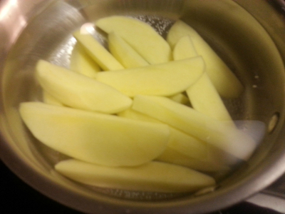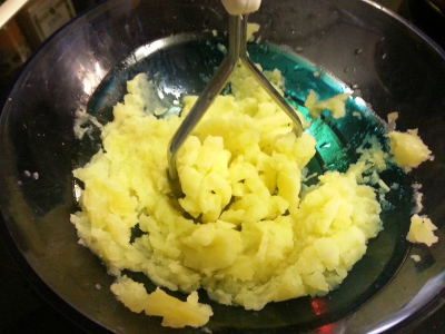Kok potetene i en kjele til de er myke ca 25 minutter.legges i et dørslag og la den avkjøles.