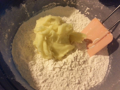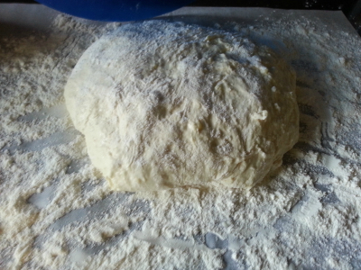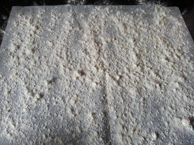 legg et bakepapir på kjøkkenbenken og strø godt med mel utover.