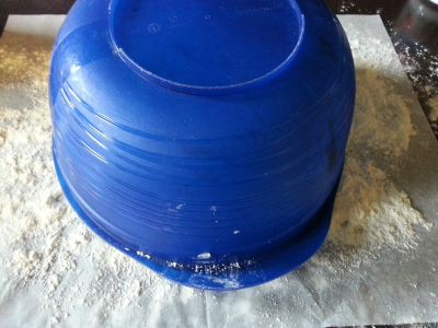 Legg deigen med bretten ned oppå det godt melete bakepapiret og hvelv bakebollen over .